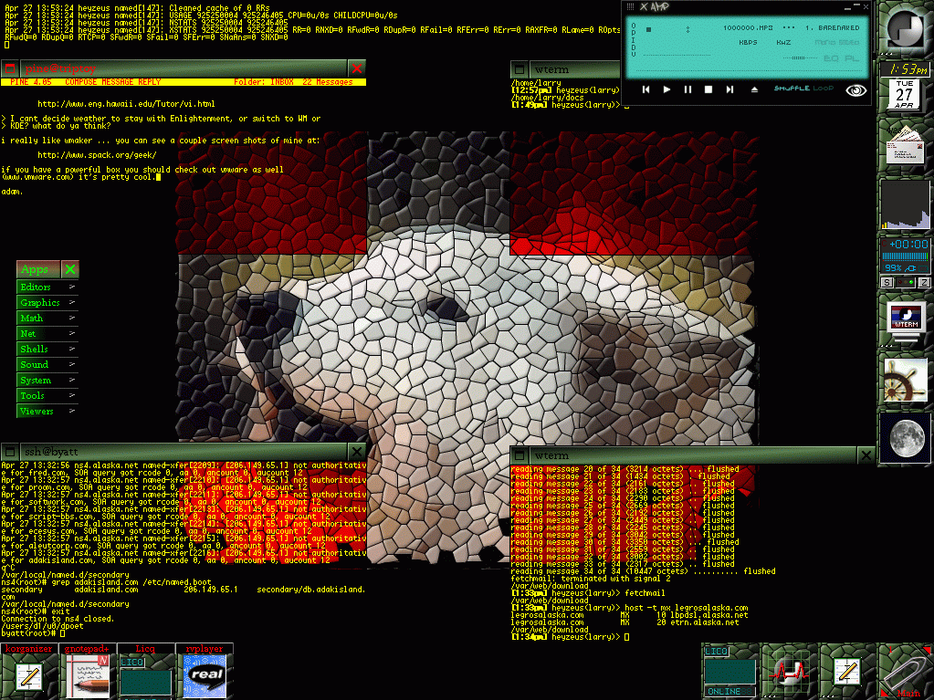 If you want you can see a couple screen shots of my desktop at here and here. I'm running WindowMaker as my window manager and wterm as my terminal.